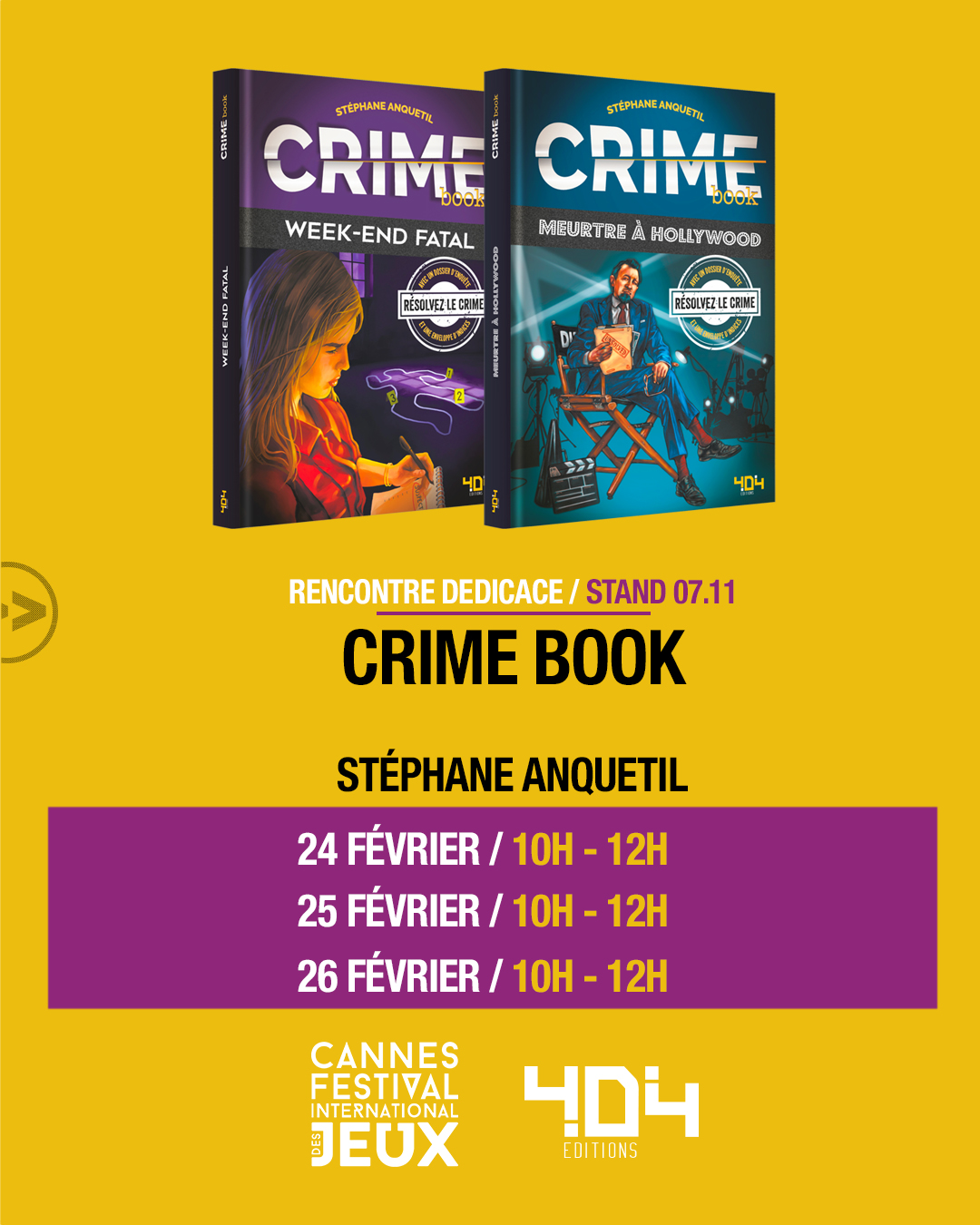 Festival International des Jeux de Cannes tous les matins, vendredi 24, samedi 25 et dimanche 26 février pour dédicacer mes Crimebooks etc. Stand 07.11 de 10h à 12h30 - 404 éditions