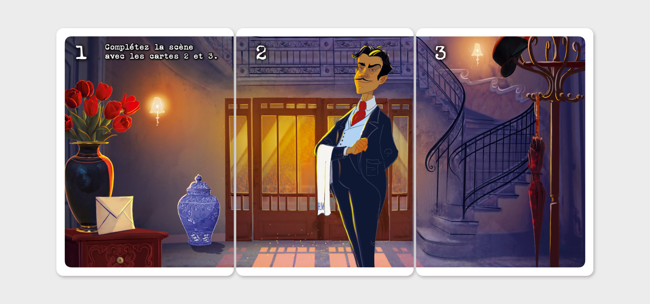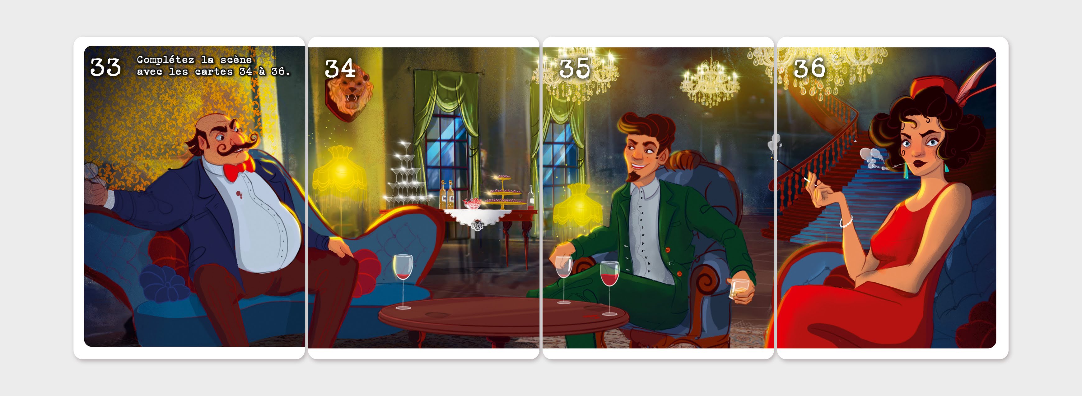 Alexis, éditeur : « Sur les 55 cartes de l’enquête, 44 servent dans des scènes illustrées ! C’est un délice visuel, dans un style qui va à 100 % avec l’atmosphère de l’enquête. »