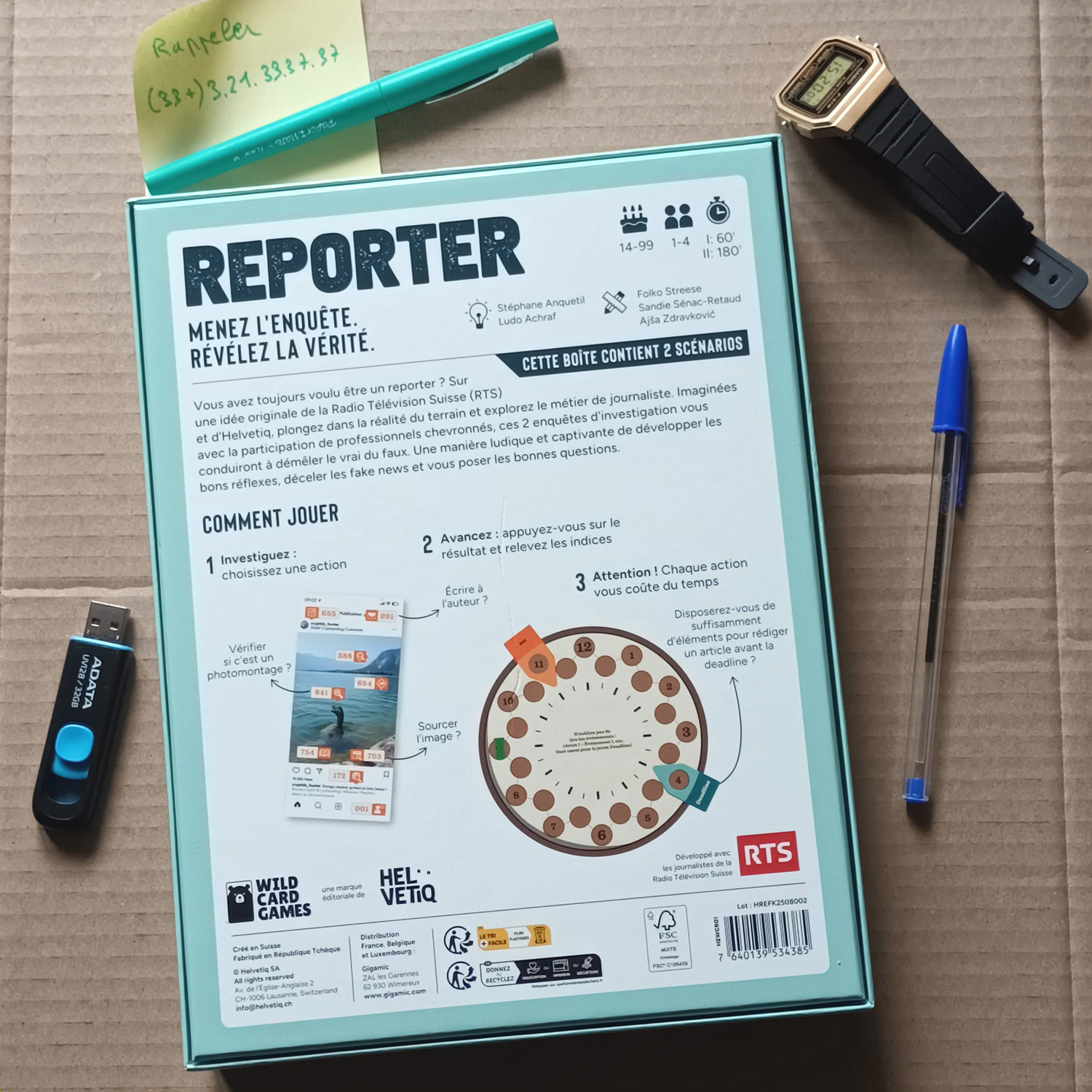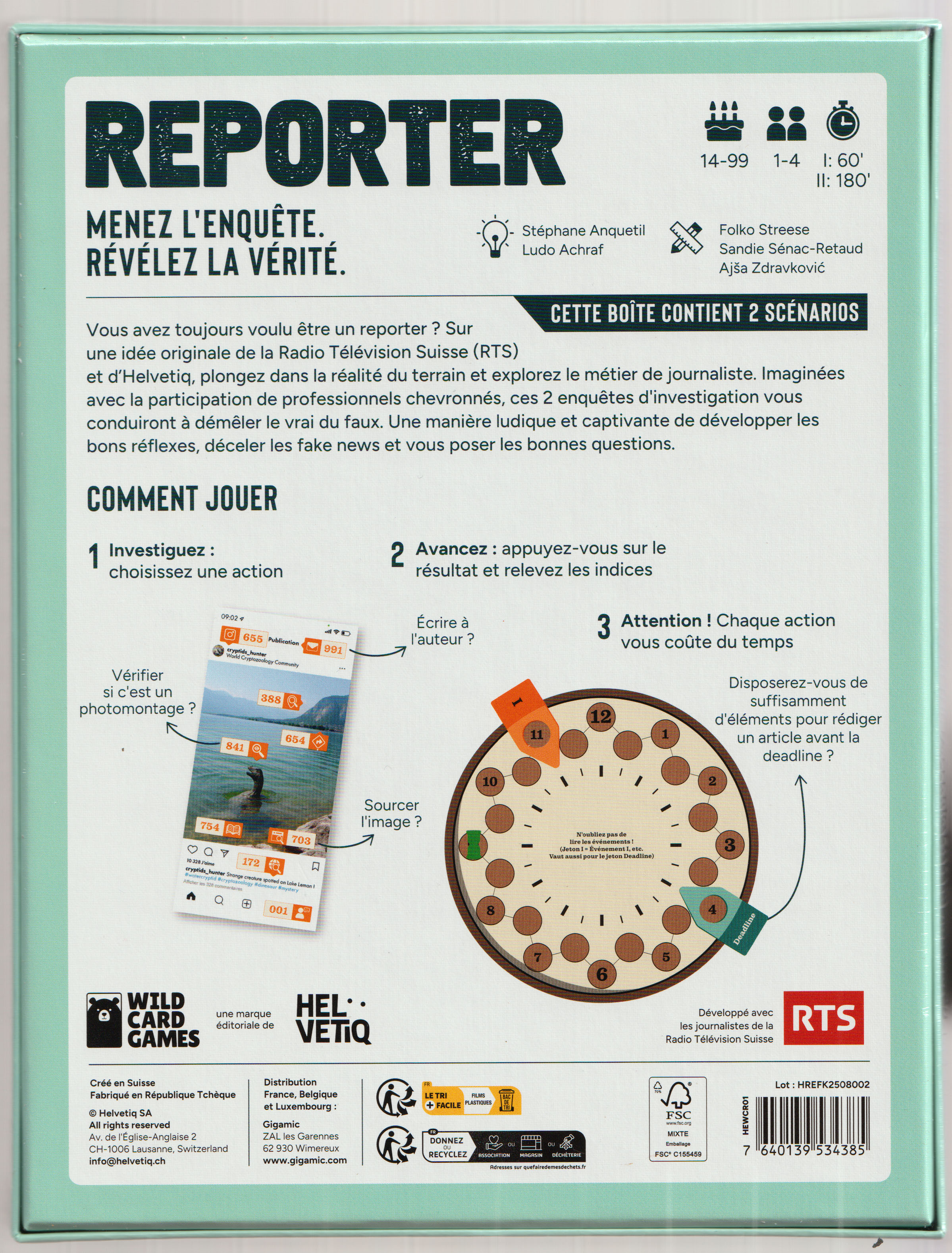 Le jeu est à la base une commande, développée et éditée par Helvetiq pour la RTS. Le titre choisi est "Reporter". La version suisse avec des labels RTS est sortie en octobre, le jeu sortira en Février 2026 en France chez Gigamic.